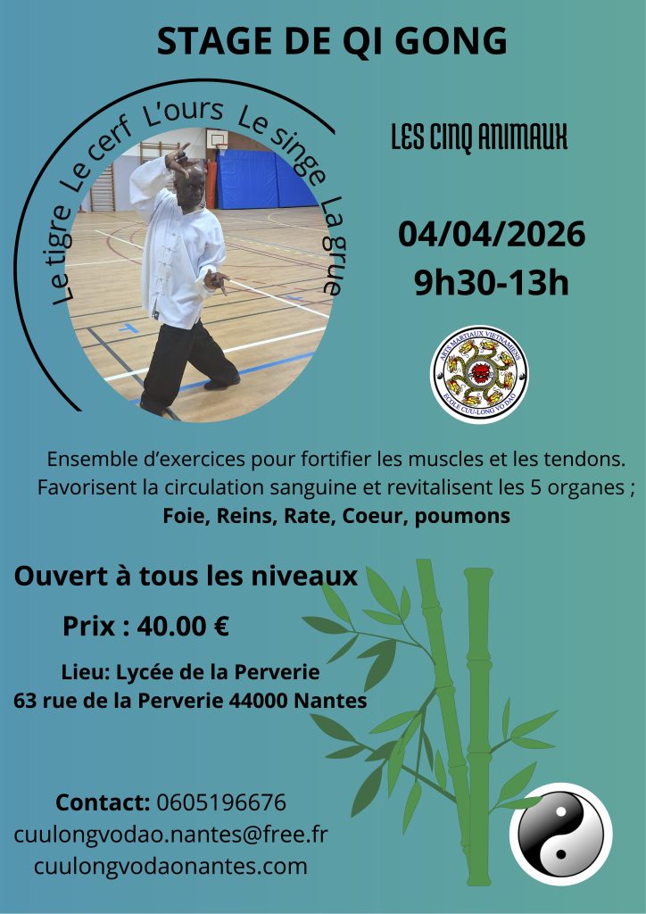 Afin de découvrir ou d’approfondir la pratique du Qi-Gong – partie intégrante de notre Ecole – Le Club subventionnera à hauteur de 50 % les frais d’inscriptions.